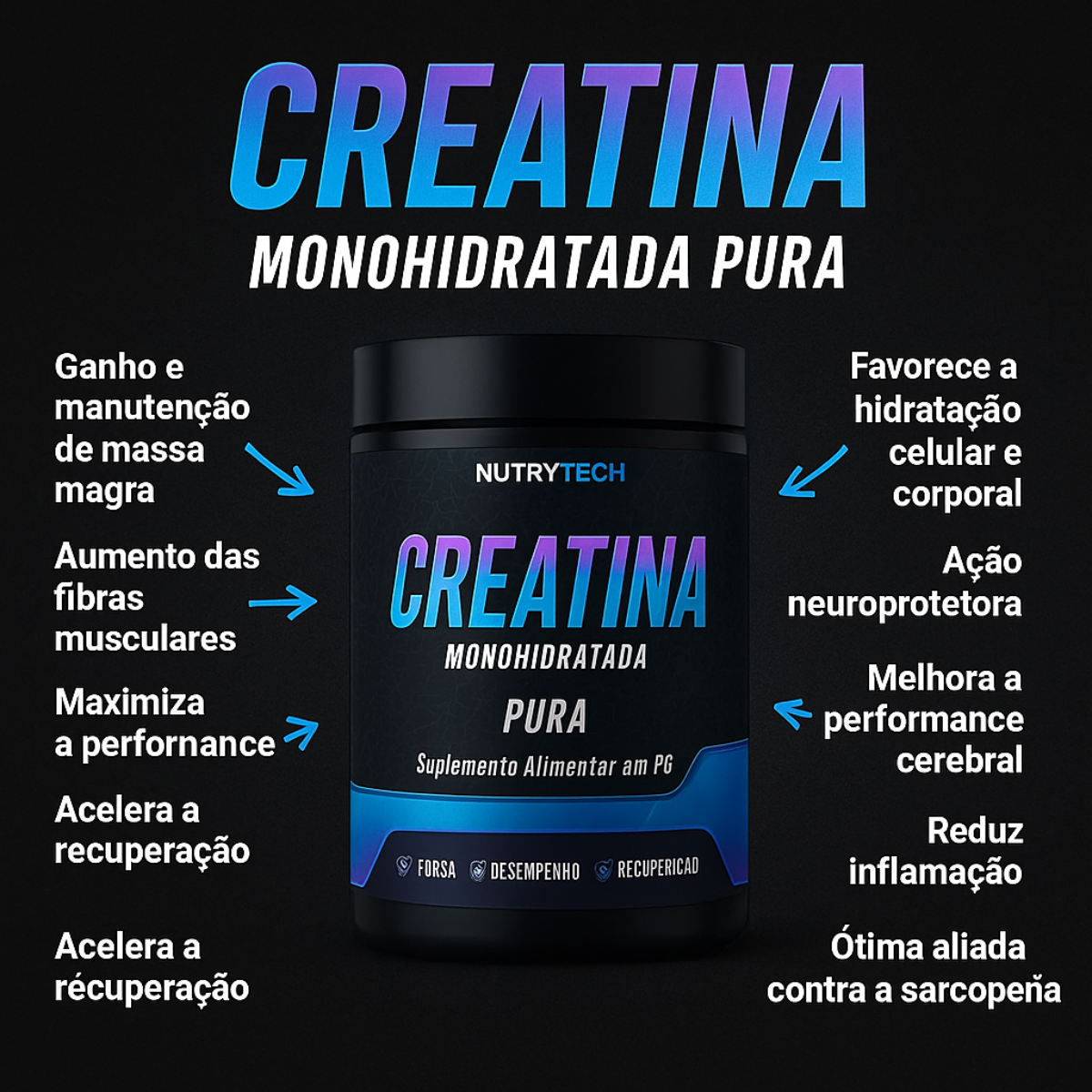 A Creatina Monohidratada Nutrytech é o suplemento ideal para quem busca melhorar a performance, aumentar a força muscular e potencializar os resultados dos treinos.
